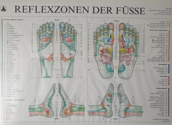 Mit der Fussreflexzonen- und Lympfreflexzonen-Therapie wird über die Haut auf die Organe, Organsysteme und den Bewegungsapparat therapeutisch Einfluss genommen. Die wohl bekanntesten Peflexzonen sind am Fuss. Bis heute wurden fast alle anatomischen Srukturen des Menschen entsprechende Zonen am Fuss festgestellt. Bei der Reflexzonentherapie werden die Organe über die entsprechenden Zonen per therapuetischen Griff stimmuliert oder sediert. Behandlung von vielen chronischen Krankheiten ist damit möglich, und mit der Kombination mit anderen Therapien kann man noch vieles mehr erreichen. Für spezifische Fragen rufen sie mich an.